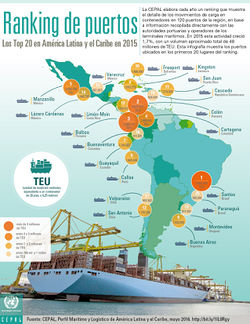 La CEPAL elabora cada año un ranking que muestra el detalle de los movimientos de carga en contenedores en 120 puertos de la región, en base a información recopilada directamente con las autoridades portuarias y operadores de los terminales marítimos. En 2015 esta actividad creció 1,7%, con un volumen aproximado total de 48 millones de TEU. La infografía de la figura adjunta muestra los puertos ubicados en los primeros 20 lugares del ranking.