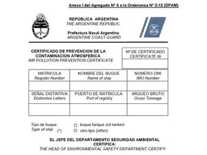 A todos los buques que cumplan con lo establecido por ésta ordenanza, la Prefectura Naval Argentinaotorgará el Certificado de Prevención de la Contaminación Atmosférica.