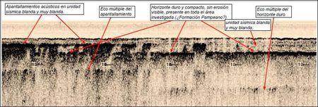 Los resultados se presentan en forma de esquemas de los perfiles transversales, en los cuales se ha dibujado la estructura geológica interpretada, referida al correspondiente perfil batimétrico levantado simultáneamente. Toda la información está referida al cero hidrográfico local, o plano de reducción, en coincidencia con el procedimiento usado para la batimetría de control de los dragados. En la Figura 2 se puede observar un perfil de la zona y elementos característicos de interpretación de la misma.